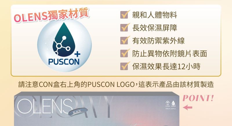 OLENS使用的PUSCON材質具有卓越的保濕效果,能長時間保持眼睛的水分,